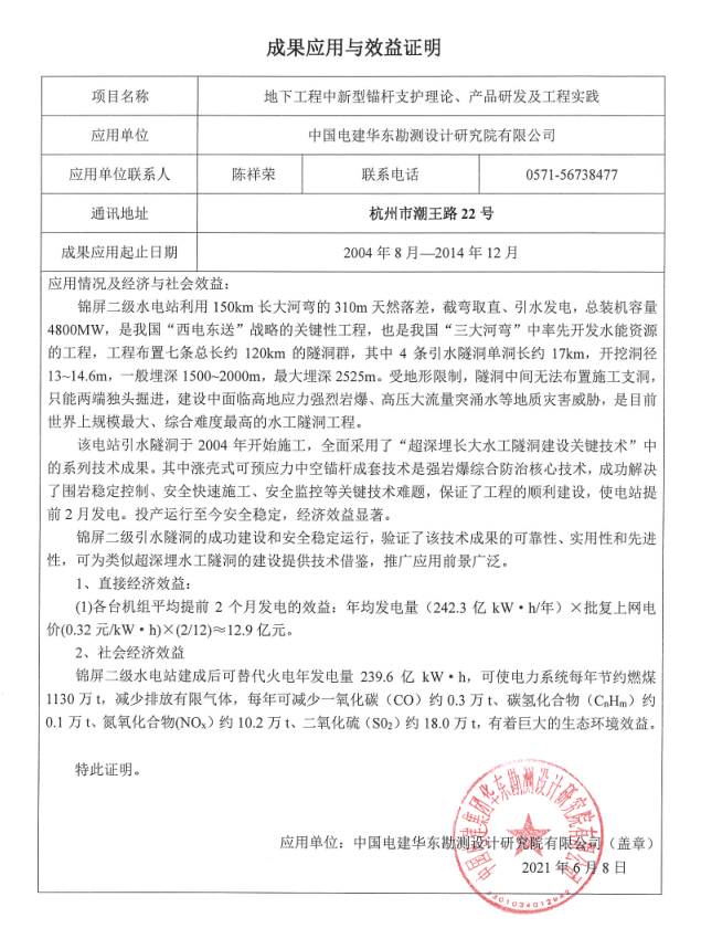 在腐蝕環境中可實現100年以上的使用壽命,填補了此項技術的國內空白。項目在2009年膠州灣海底隧道已得到成功應用,至今效果明顯。膠州灣二隧道正在應用中。更是將在海南海底通道、以及煙大海底隧道、臺灣海峽隧道等開挖支護中提供有力保障。